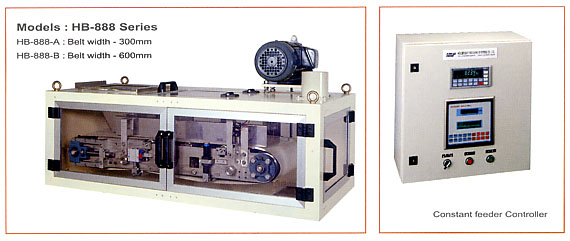 - 輸送模組: Model HB-888可應用於二種輸送模組中的任何一種。標準模組除了鋁製頭尾滑輪(300mm, 600mm大小)、計重單位(300mm, 600mm大小)、和鑄鐵軸承蓋外,都是用304不鏽鋼製成。另有全以304不鏽鋼製加Teflon外包軸承蓋的模組可供選擇,也有可水洗的不鏽鋼模組可供選擇。所有種類的模組都是配備標準規格的螺旋型皮帶提昇裝置。另有自動調整皮帶張力裝置的設計。